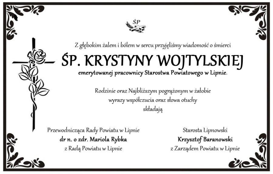 Z głębokim żalem i bólem w sercu przyjęliśmy wiadomość o śmierci Śp. Krystyny Wojtylskiej emerytowanej pracownicy Starostwa Powiatowego w Lipnie. Rodzinie oraz Najbliższym pogrążonym w żałobie wyrazy współczucia oraz słowa otuchy składają.