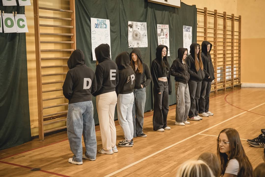 W ramach Szkolnego Dnia Świadomości o Zdrowiu Psychicznym młodzież przygotowała poruszający performance, który skłaniał do refleksji i zrywał z powszechnymi stereotypami dotyczącymi depresji. W rytmie emocji, gestów i symbolicznych obrazów, uczniowie prezentowali własne doświadczenia, pokazywali złożoność ludzkich emocji i wskazywali, jak ważne jest zrozumienie, akceptacja i gotowość do wsparcia.